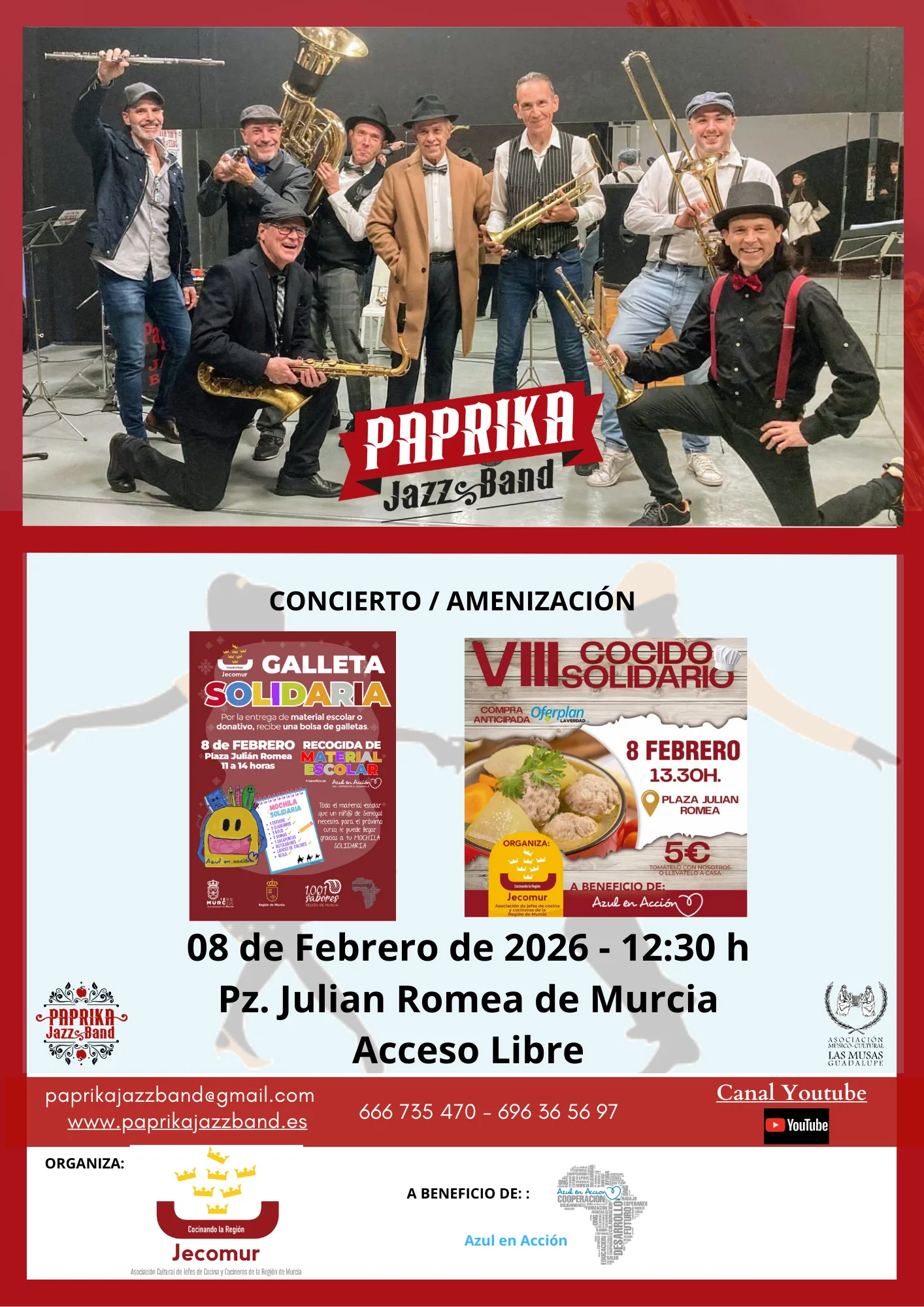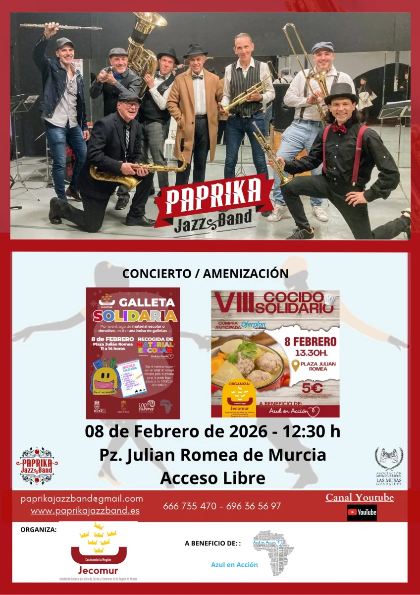 Rag Time, Foxtrot, Charleston, Swing…, la Paprika Jazz Band, fundada a finales de 2019 por algunos músicos “senior” de la Asociación Músico Cultural Las Musas de Guadalupe (Murcia), interpreta temas clásicos de estos y otros estilos de los orígenes y primeras décadas del Jazz. Es música sincopada, nacida del folklore afroamericano, pero con multitud de influencias y ramificaciones en su evolución; música divertida y optimista para bailar y alegrar tiempos difíciles.
